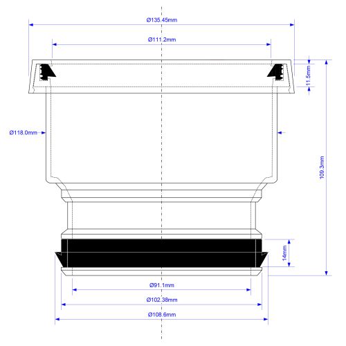Применяется для перехода с чугунной трубы на пластиковую канализационную трубу, диаметром 110 мм.
