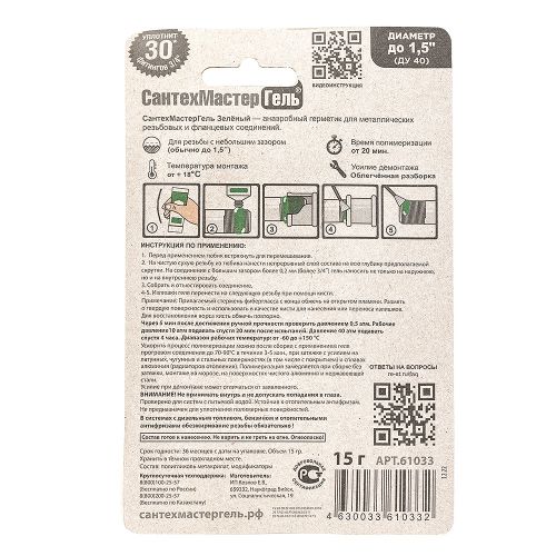 СантехМастер Гель синий - это анаэробный герметик для металлической резьбы со стандартным (средним) зазором и металлических фланцев.